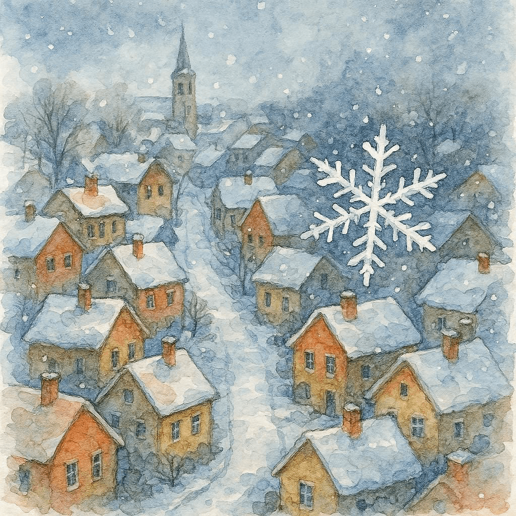 As it descends, the world sharpens into view. It sees rooftops dusted with frost, bare trees lifting their branches like open hands, and distant figures bundled in layers, moving through the cold with their own quiet purpose. It catches the glint of light on icy windows, hears the hush of a landscape holding its breath. Every drift brings it closer to the pulse of life — laughter echoing from a doorway, the bark of a dog racing through a yard, the crunch of footsteps carving paths through untouched snow. The snowflake watches it all with a kind of tender longing, aware of its fleeting existence but drawn to the warmth and the motion below.