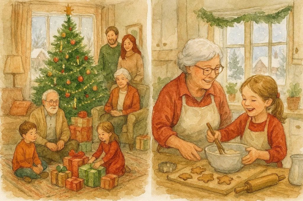 The kitchen smells like love. Grandma is already busy, moving gently, humming to herself. The air is filled with butter, sugar, and something warm and savory baking in the oven. It wraps around me like a blanket. Grandpa’s chair creaks, plates clink, and the house feels full of small, happy sounds. When the gifts finally start opening, paper tears and ribbons fall everywhere, but it’s loud and joyful. Everything feels bright and cozy and just right, and I wish the perfection of this moment could last forever.